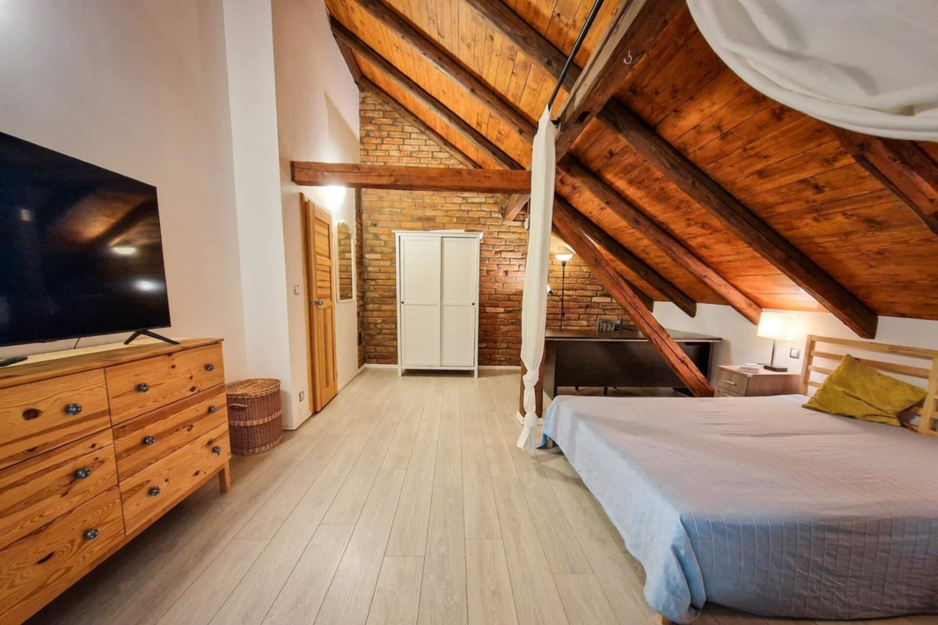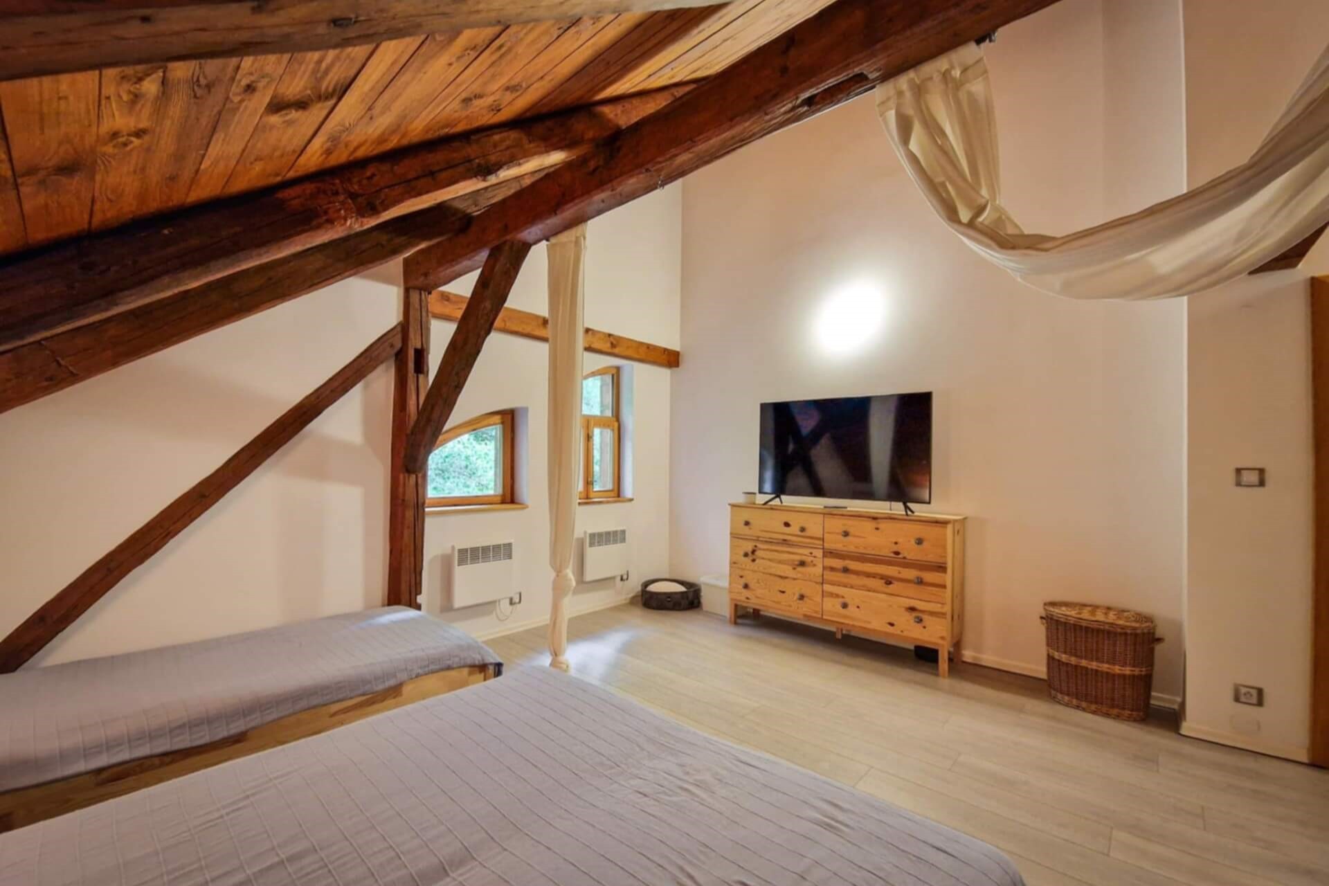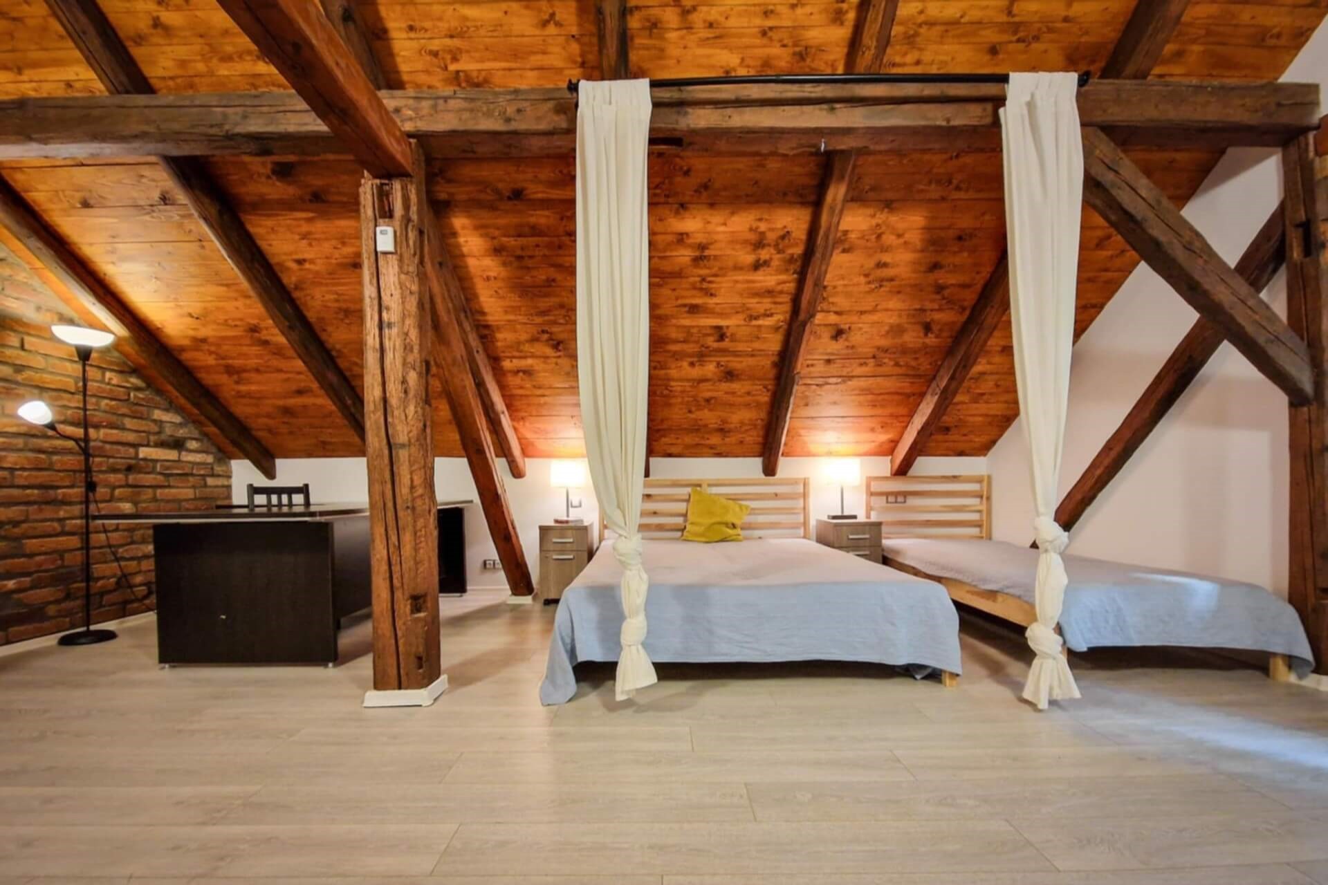 Náš hlavní a největší pokoj, který představuje vdech horského luxusu. Prostorná ložnice s ručně opracovanými původními trámy s výhledem na hory a vlastním pracovním koutkem a místem pro nikým nerušenou ranní kávu.