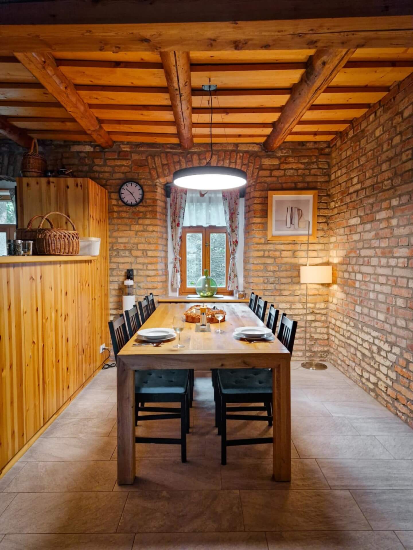 Prostorný jídelní stůl z masivního dubu pro až 10 osob. Místo pro společná jídla a dlouhé rozhovory.