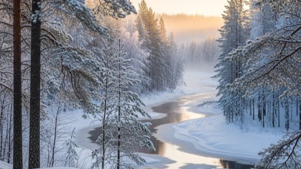 Zasněžené výhledy z oken, praskající oheň v krbu, horký čaj a zimní pohoda.